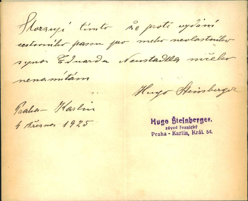 Neustadtl Eduard: Souhlas s vydáním cestovního pasu
