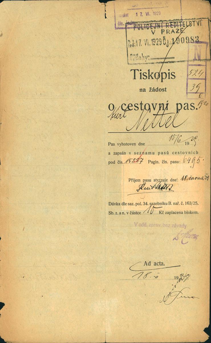 Nettl Kurt: Žádost o vydání cestovního pasu