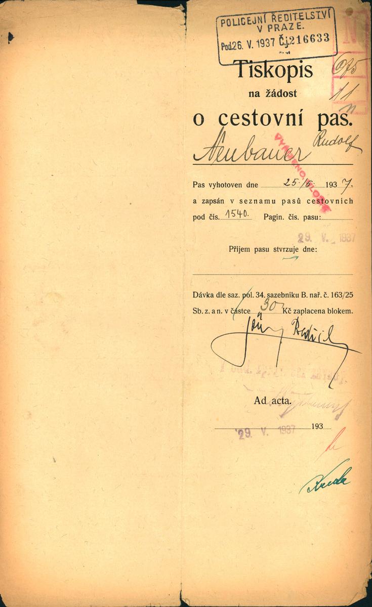 Neubauer Rudolf: Žádost o prodloužení cestovního pasu