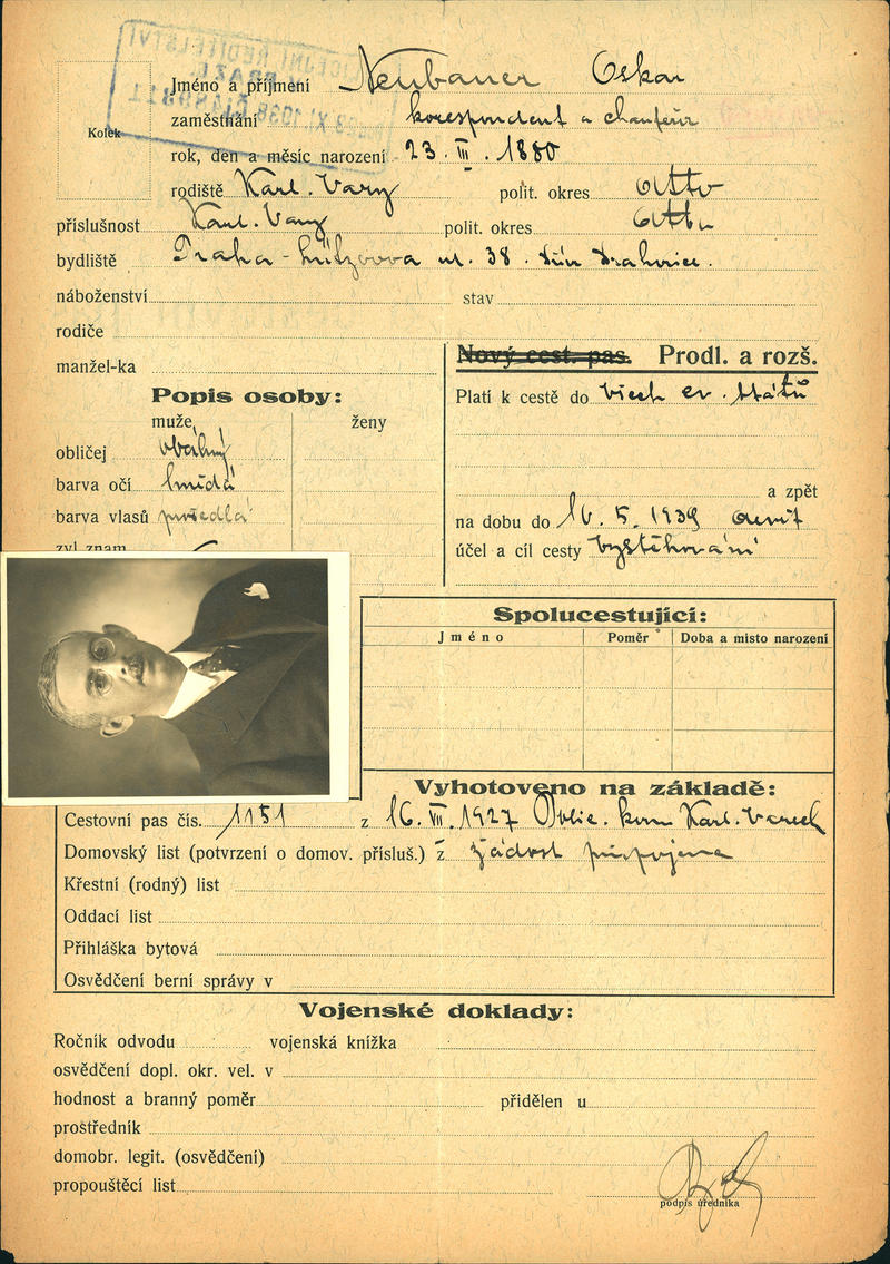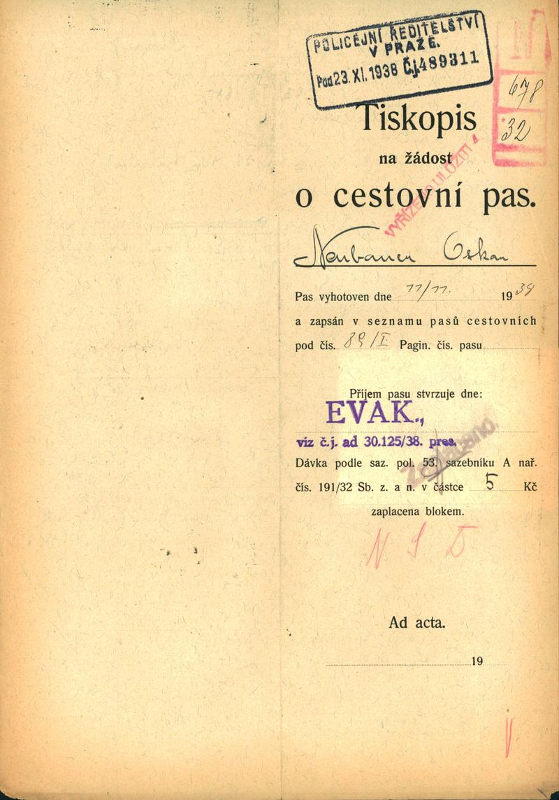Neubauer Oskar: Žádost o vydání cestovního pasu