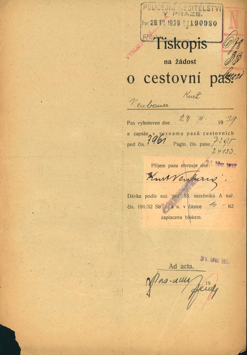 Neubauer Kurt: Žádost o vydání cestovního pasu