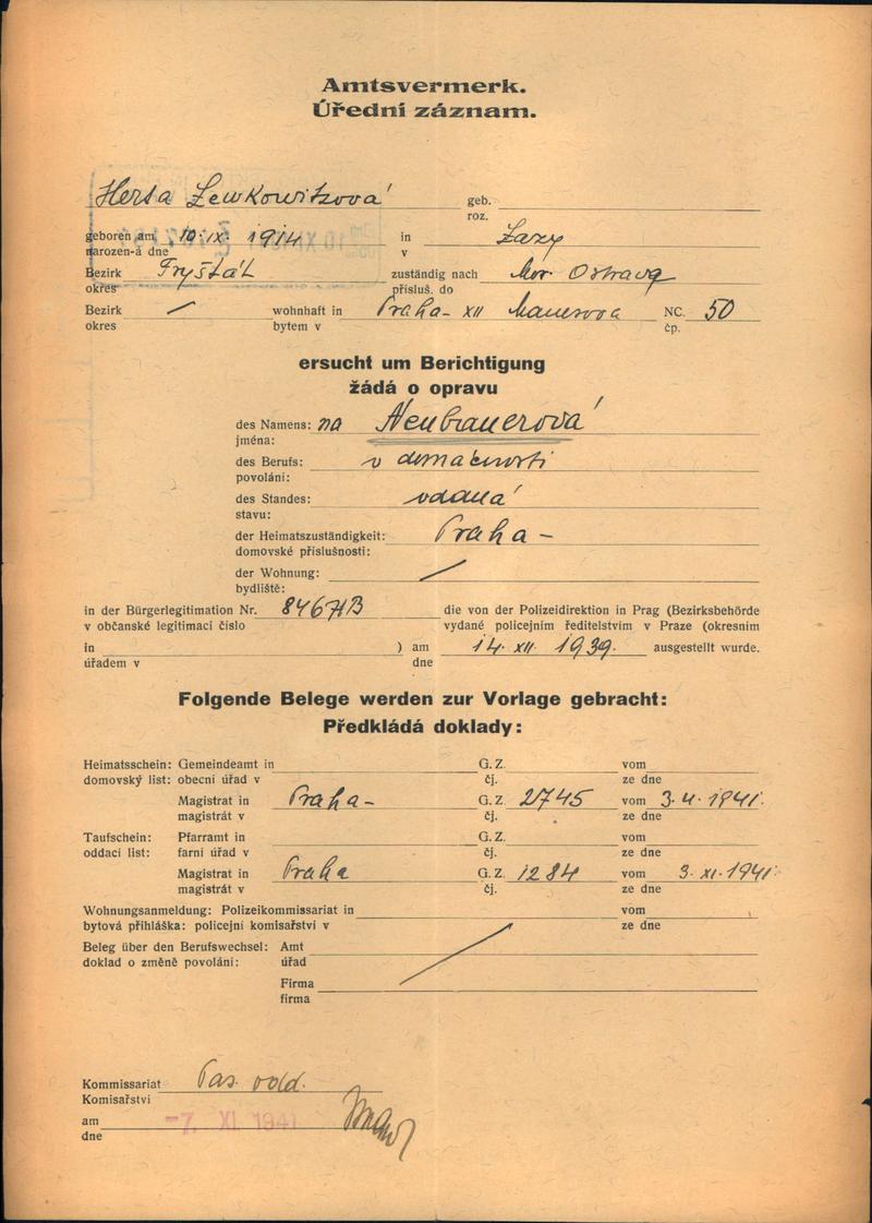 Neubauerová Berta: Žádost o opravu v občanské legitimaci