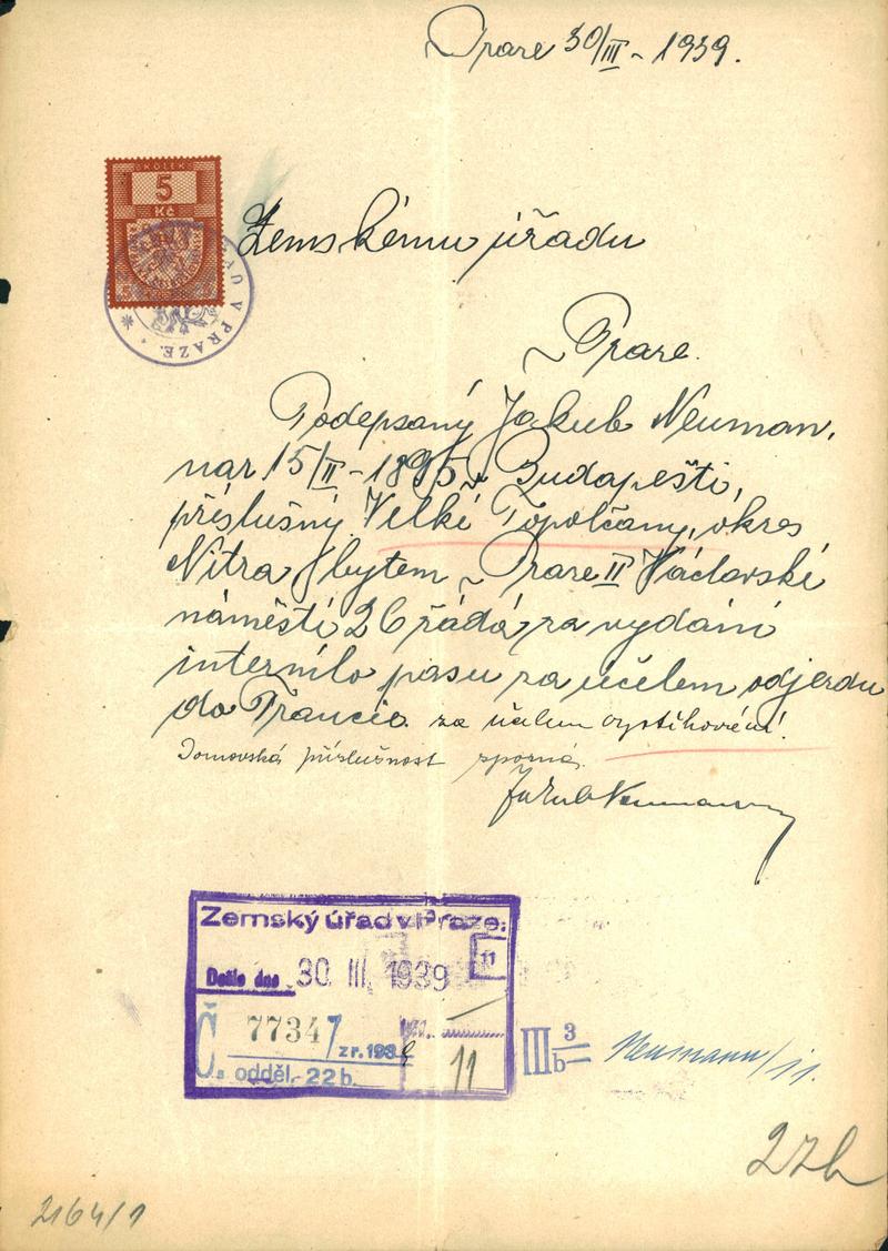 Neumann Jakub: Žádost o vydání cestovního pasu