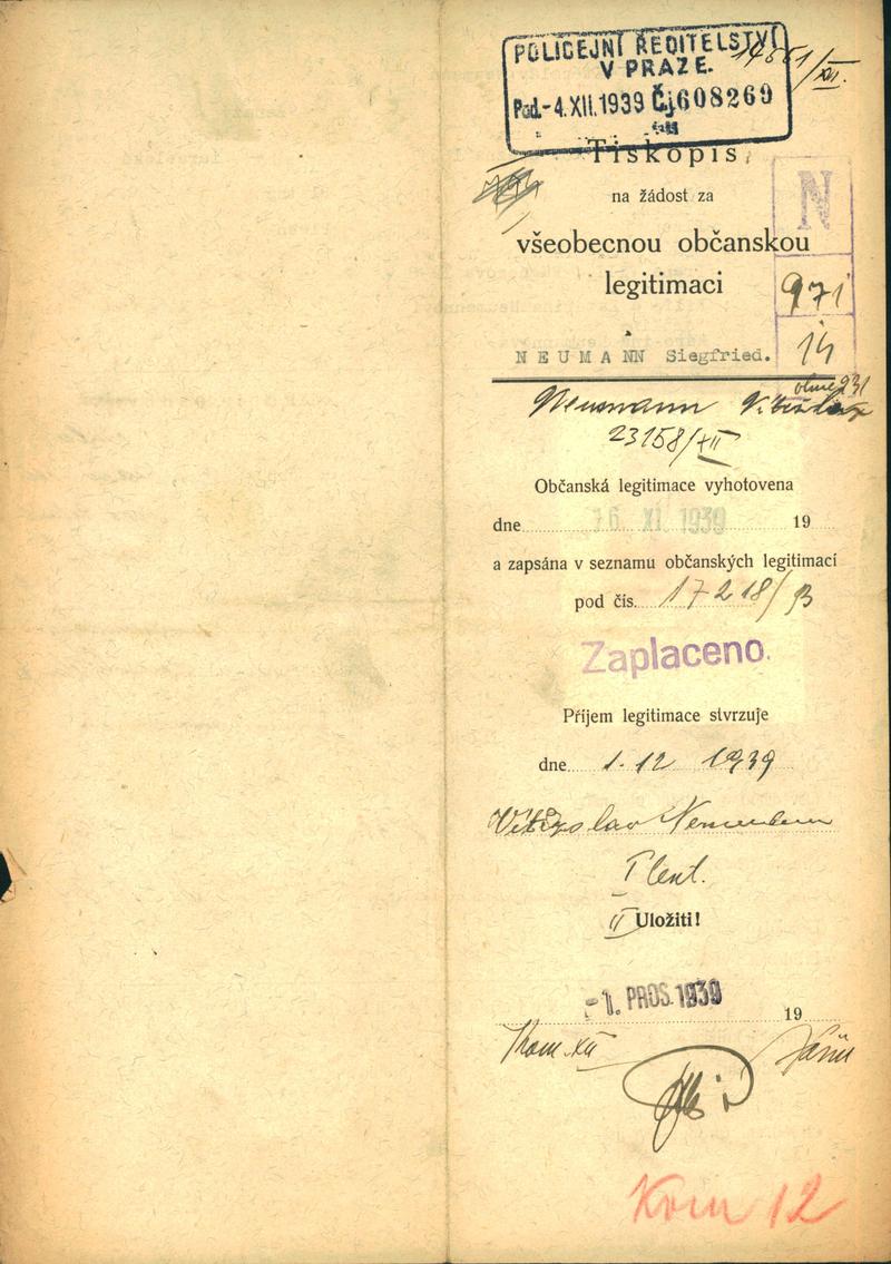 Neumann Vítězslav: Žádost o vydání občanské legitimace