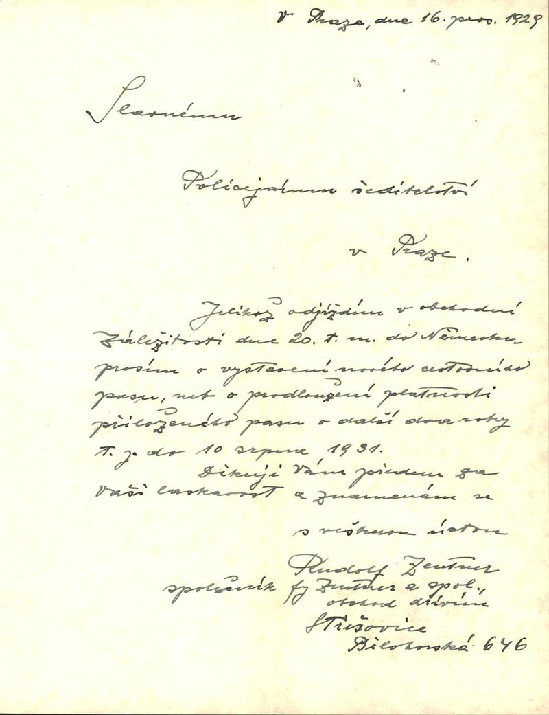 Zentner Rudolf: Žádost o vydání cestovního pasu
