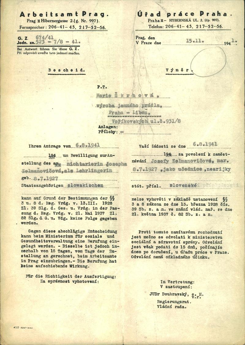 Zelmanoviczová Josefina: Vyjádření k žádosti o přijetí nearijky do učení