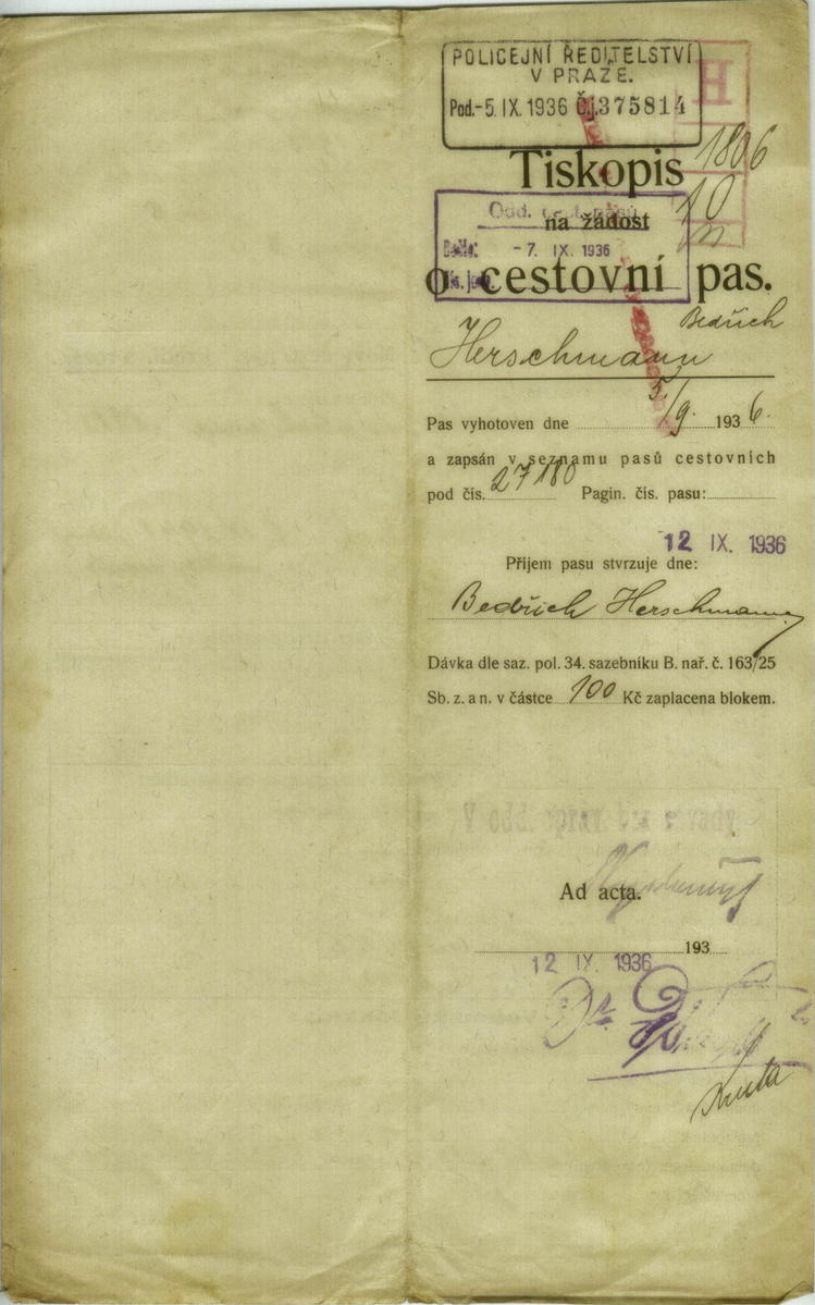 Herschmann Fritz: Žádost o prodloužení cestovního pasu
