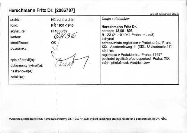 For publication purposes, contact the National Archives in Prague, where the original document is located. The document was digitized by the Terezín Initiative Institute, the Terezín Album project