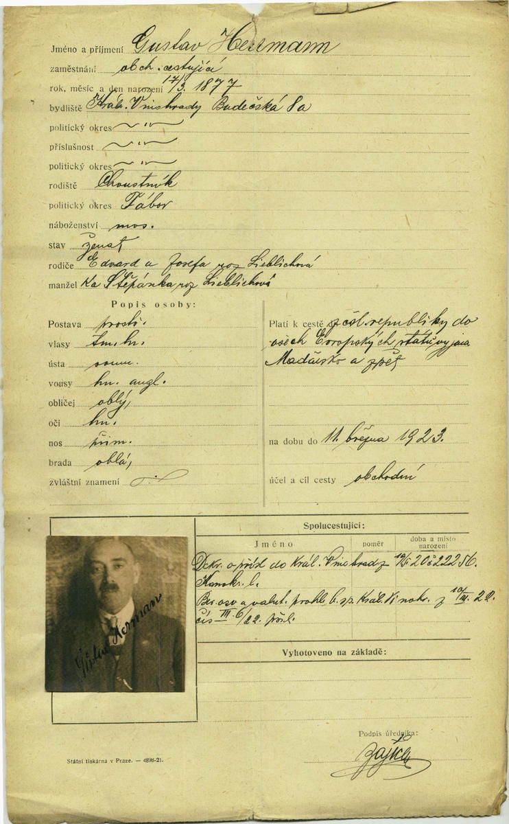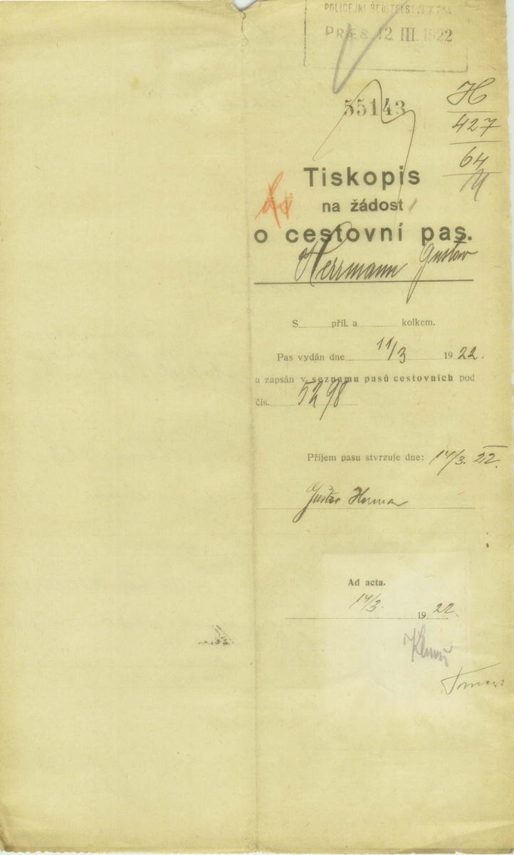 Herrmann Gustav: Žádost o vydání cestovního pasu