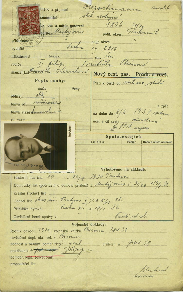 Herschmann Adolf: Žádost o vydání cestovního pasu