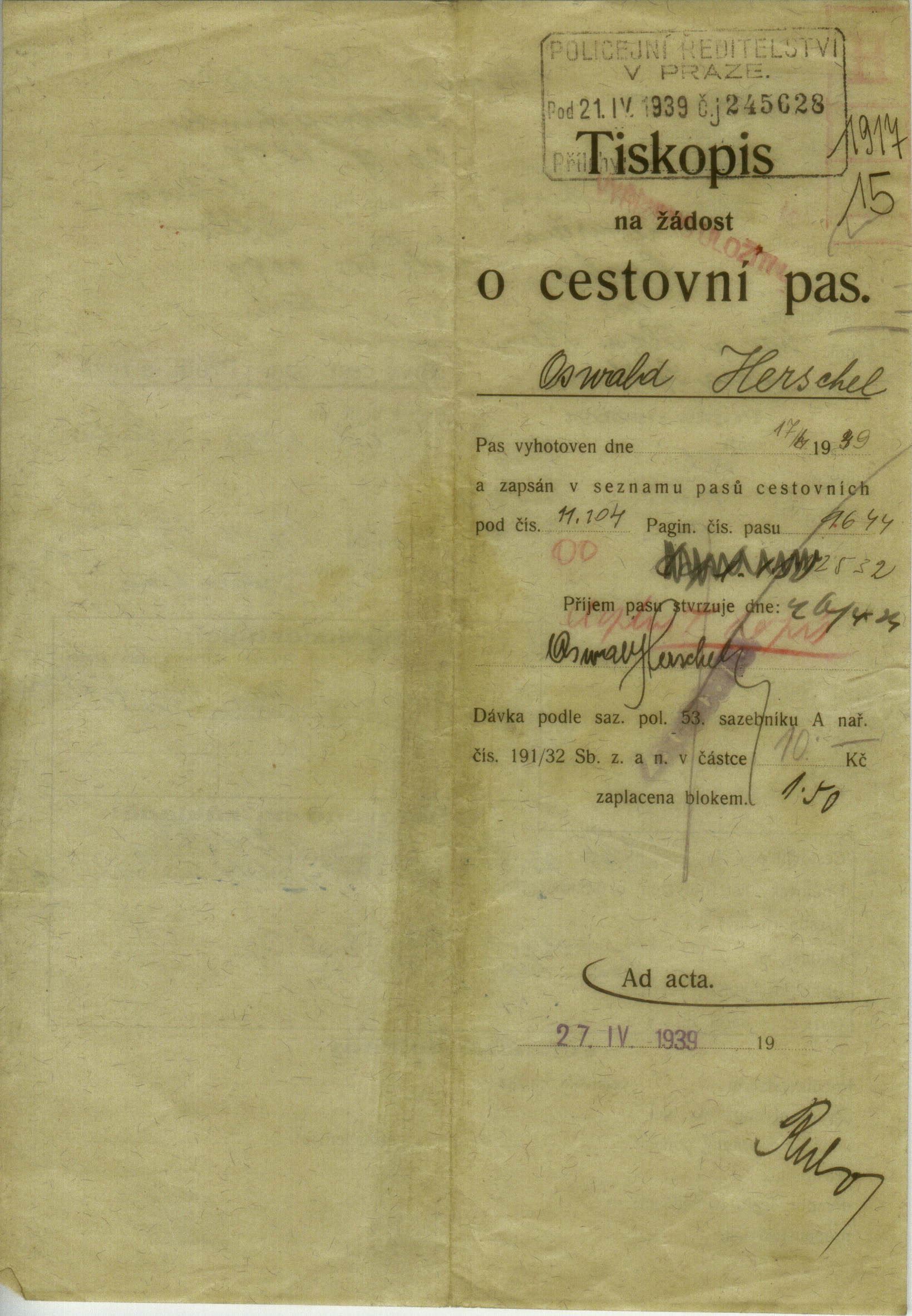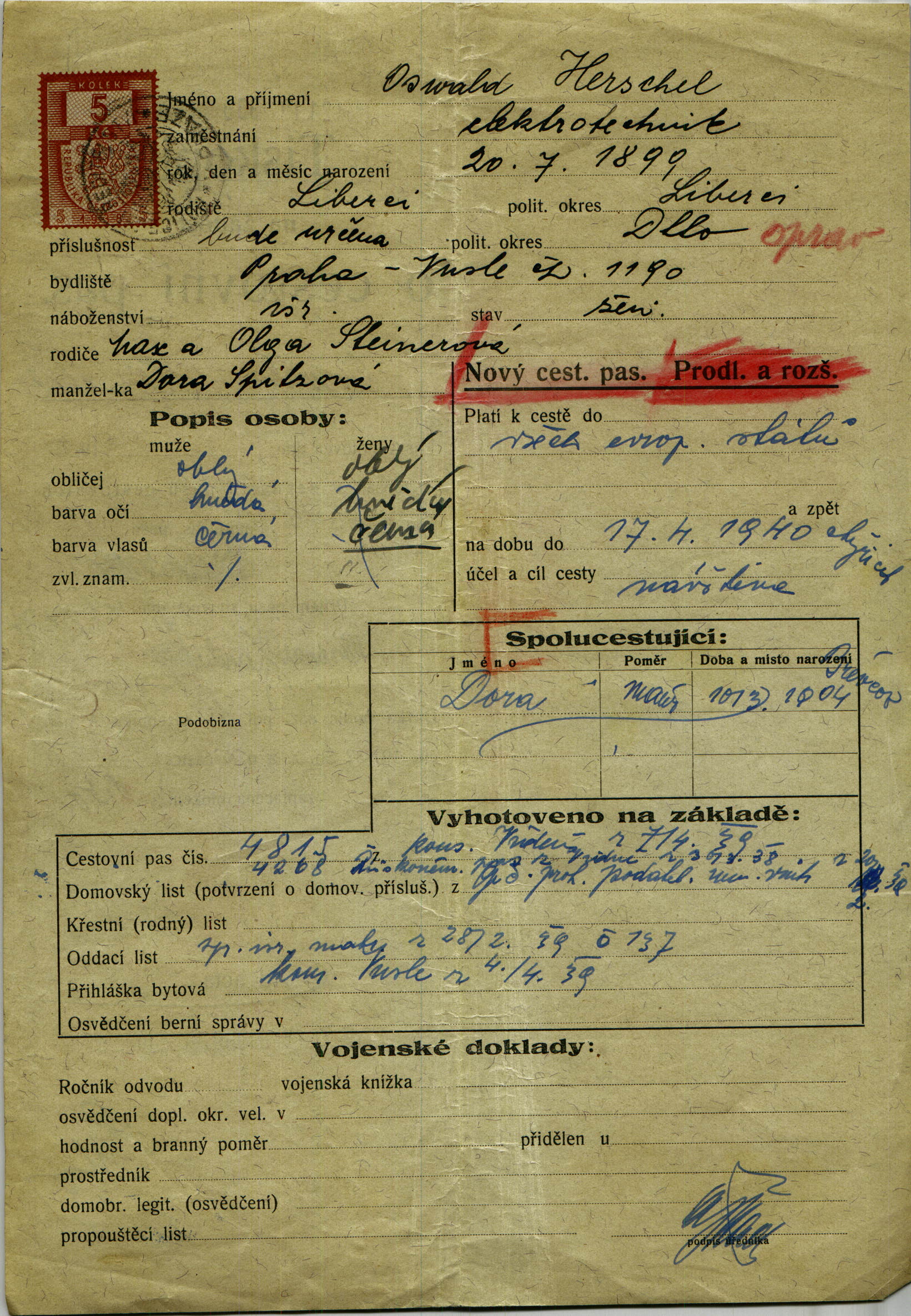 Herschel Osvald: Žádost o připsání manželky do cestovního pasu
