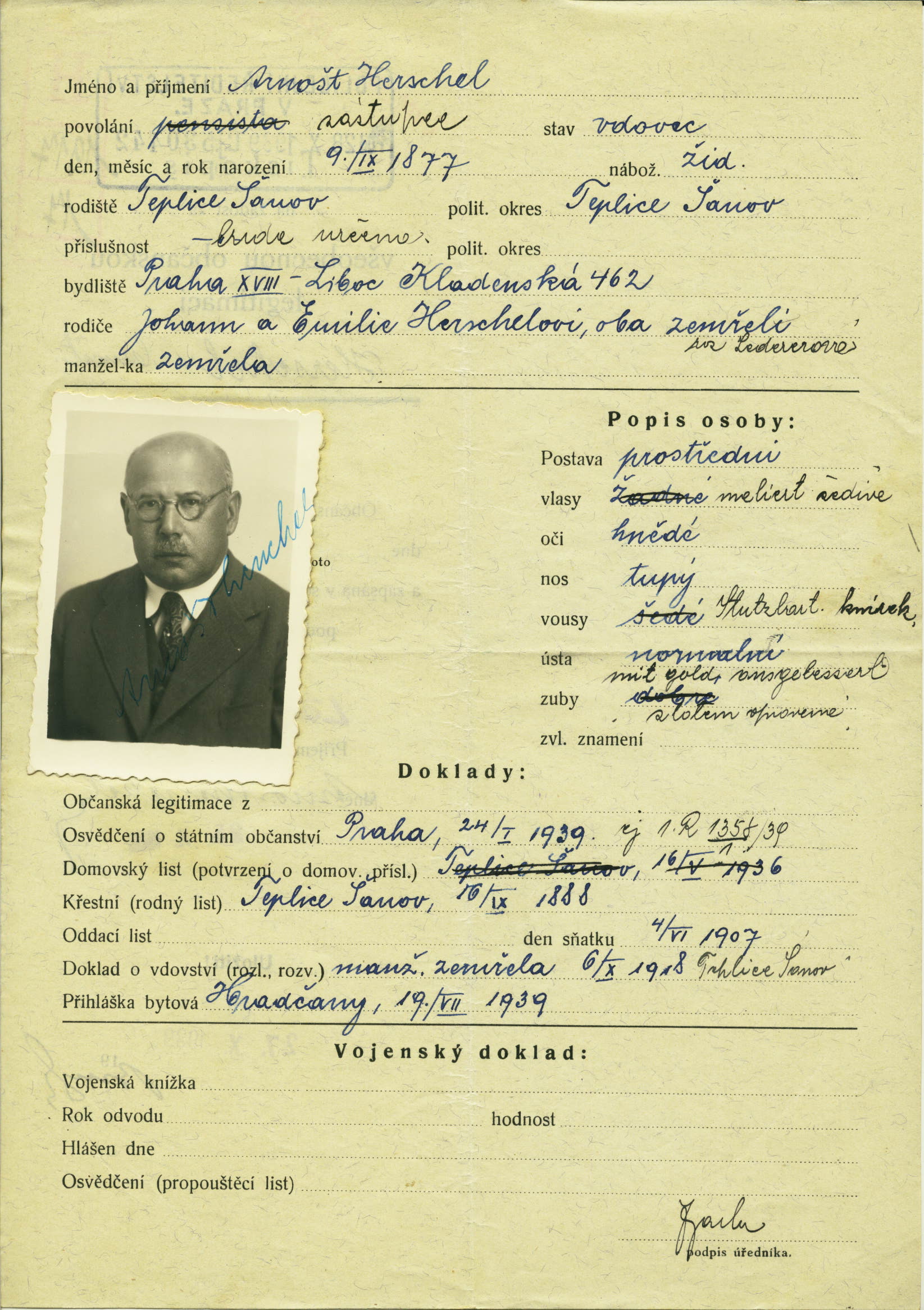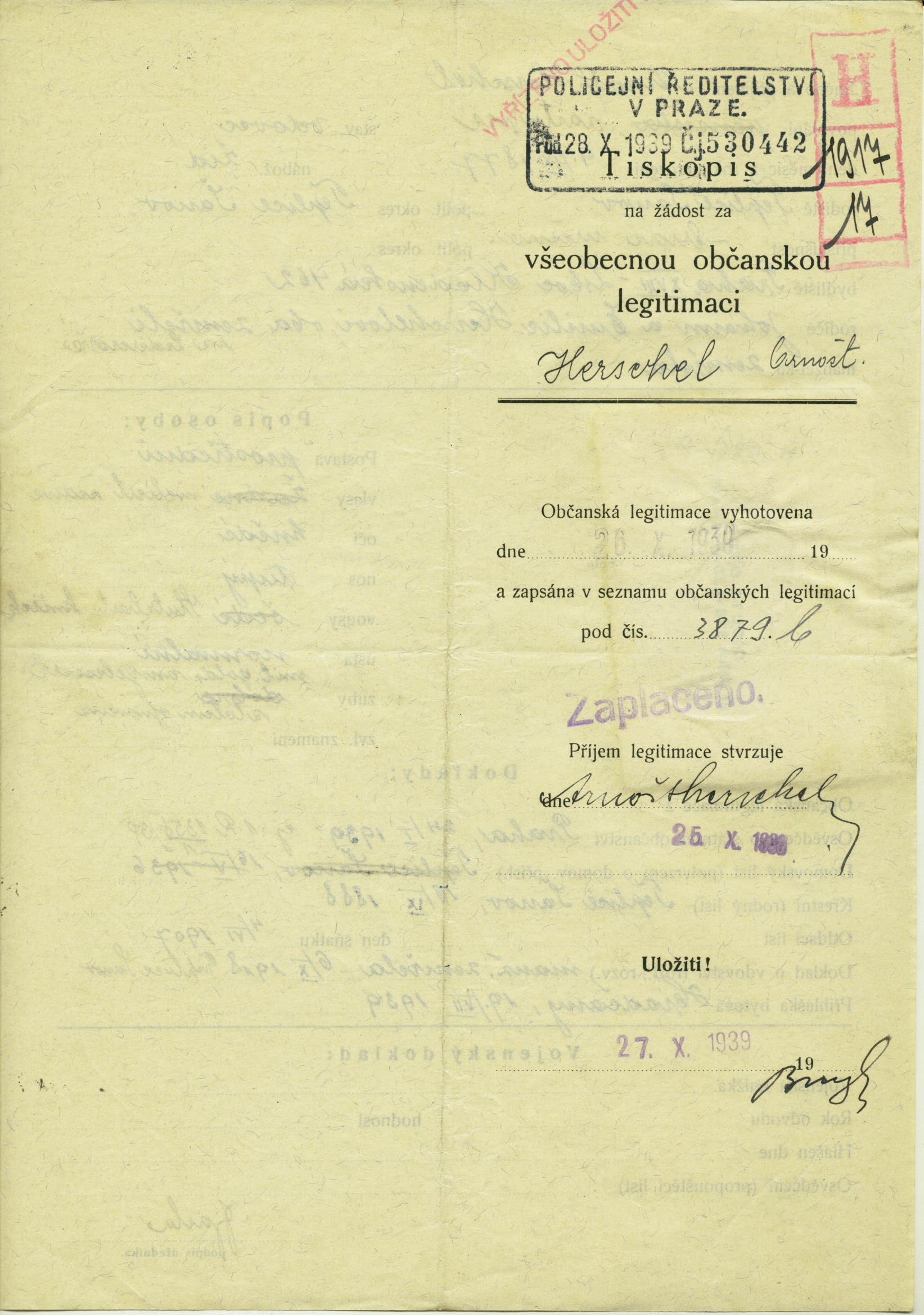 Herschel Arnošt: Žádost o vydání občanské legitimace
