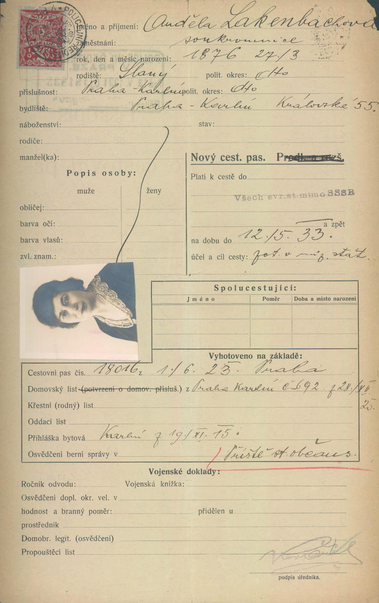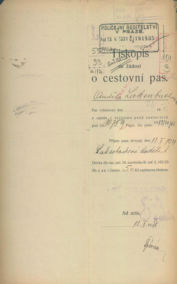 Lakenbachová Angela: Žádost o vydání cestovního pasu