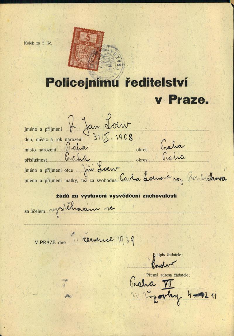 Löw Hanuš: Žádost o vystavení vysvědčení zachovalosti
