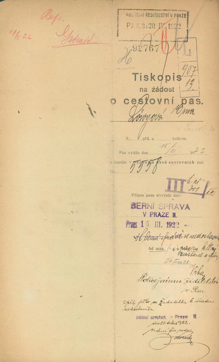 Löwiová Arnoštka: Žádost o vydání cestovního pasu