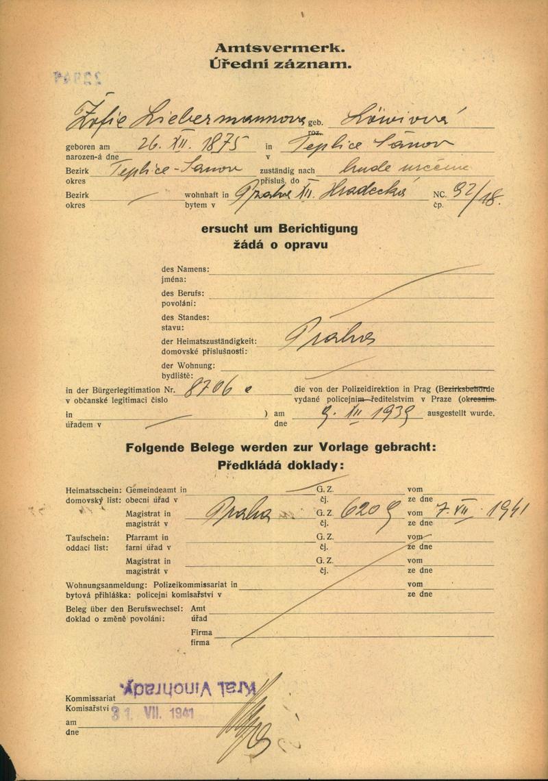 Liebermannová Sofie: Žádost o opravu v občanské legitimaci