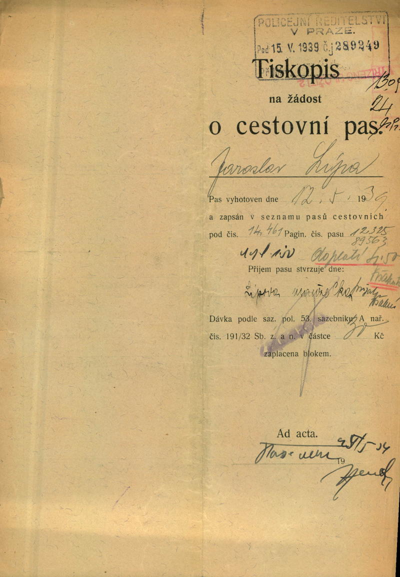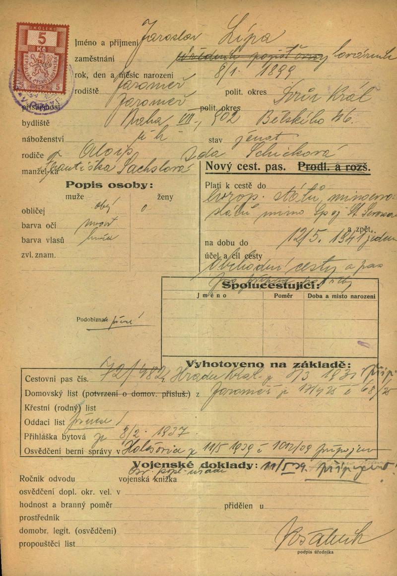 Lípa Jaroslav: Žádost o vydání cestovního pasu