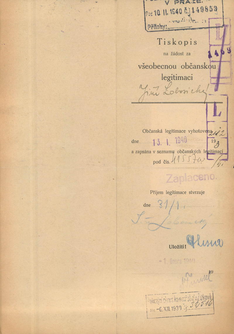 Lobosický Jiří: Žádost o vydání občanské legitimace