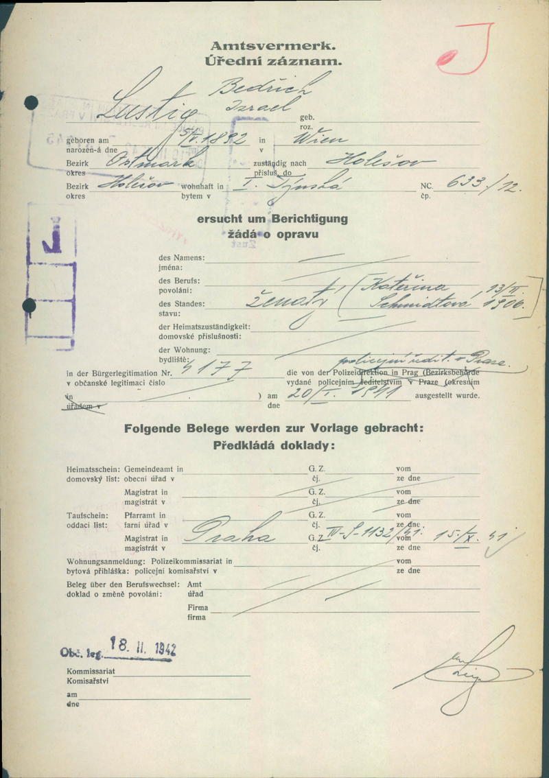 Lustig Bedřich: Žádost o opravu občanské legitimace