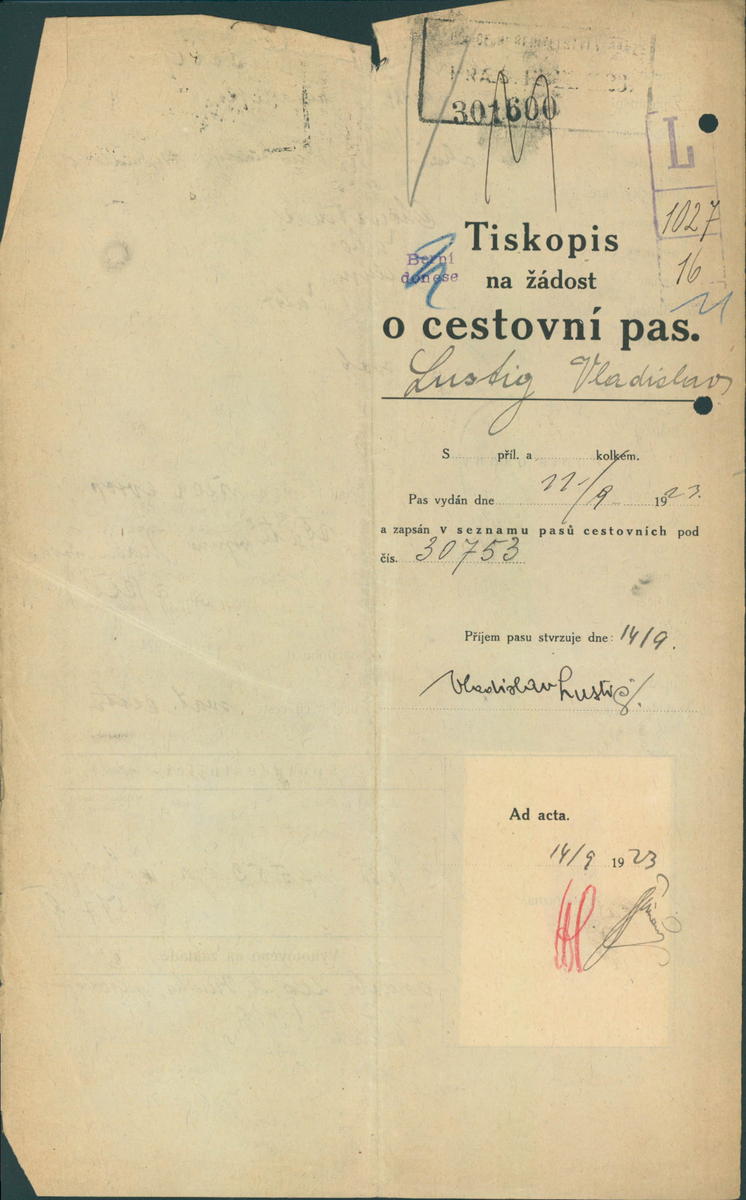 Lustig Vladislav: Žádost o vydání cestovního pasu