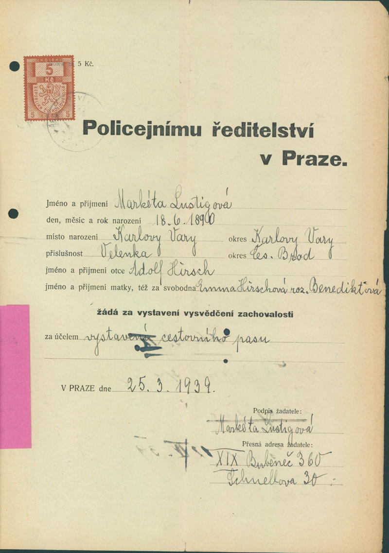Lustigová Markéta: Žádost o vystavení vysvědčení zachovalosti