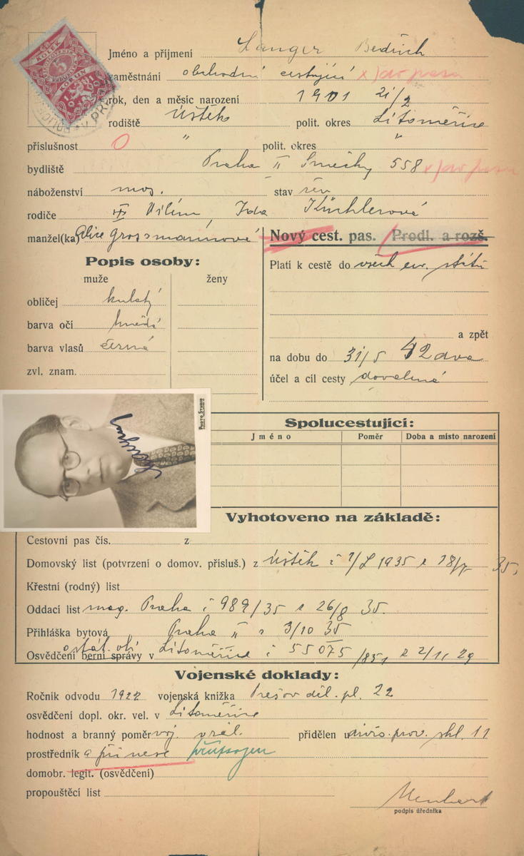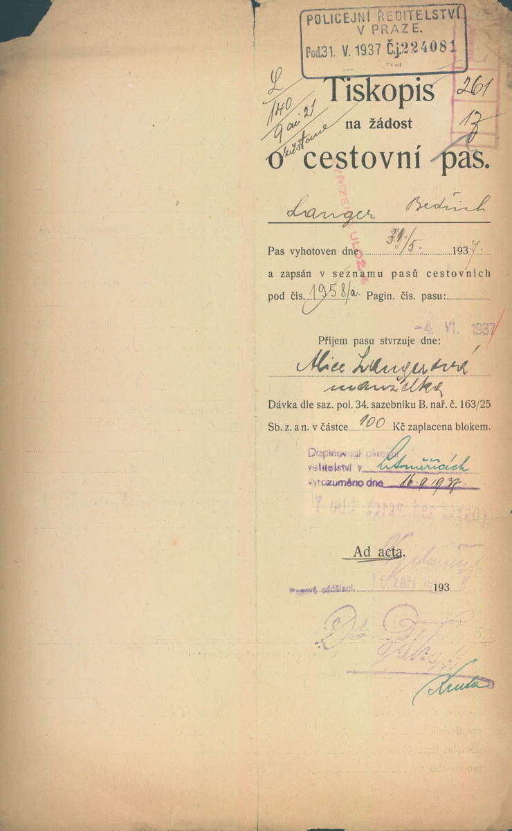 Langer Bedřich: Žádost o prodloužení a rozšíření cestovního pasu