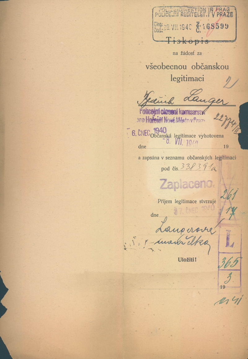 Langer Bedřich: Žádost o vydání občanské legitimace