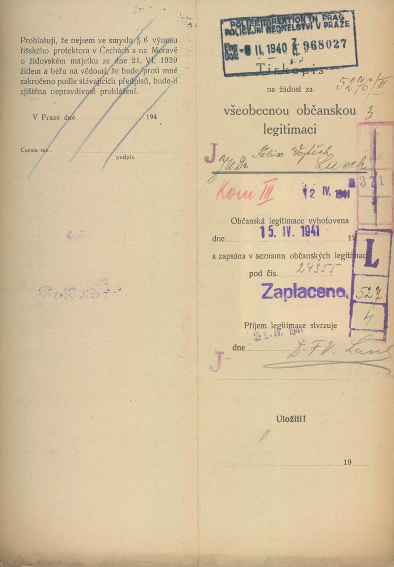 Lasch Felix Adalbert: Žádost o vydání občanské legitimace
