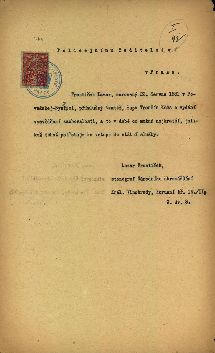 Lazar František: Žádost o vystavení vysvědčení zachovalosti