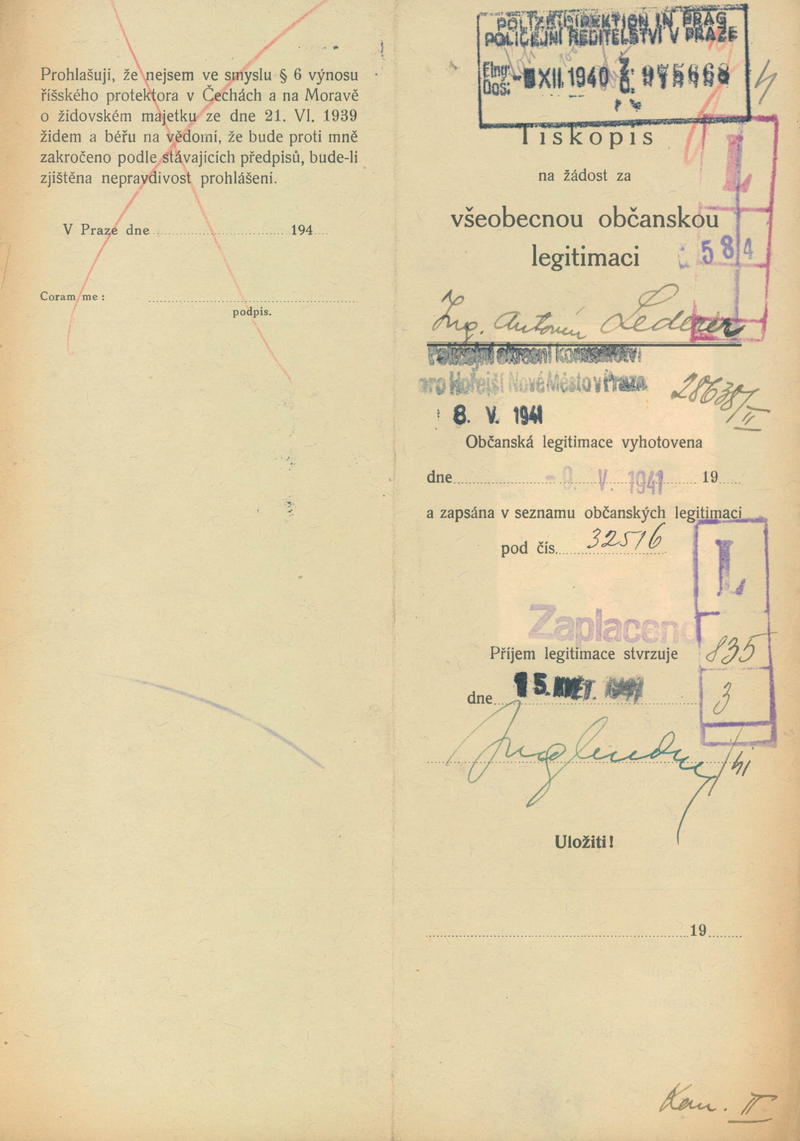 Lederer Antonín: Žádost o vydání občanské legitimace
