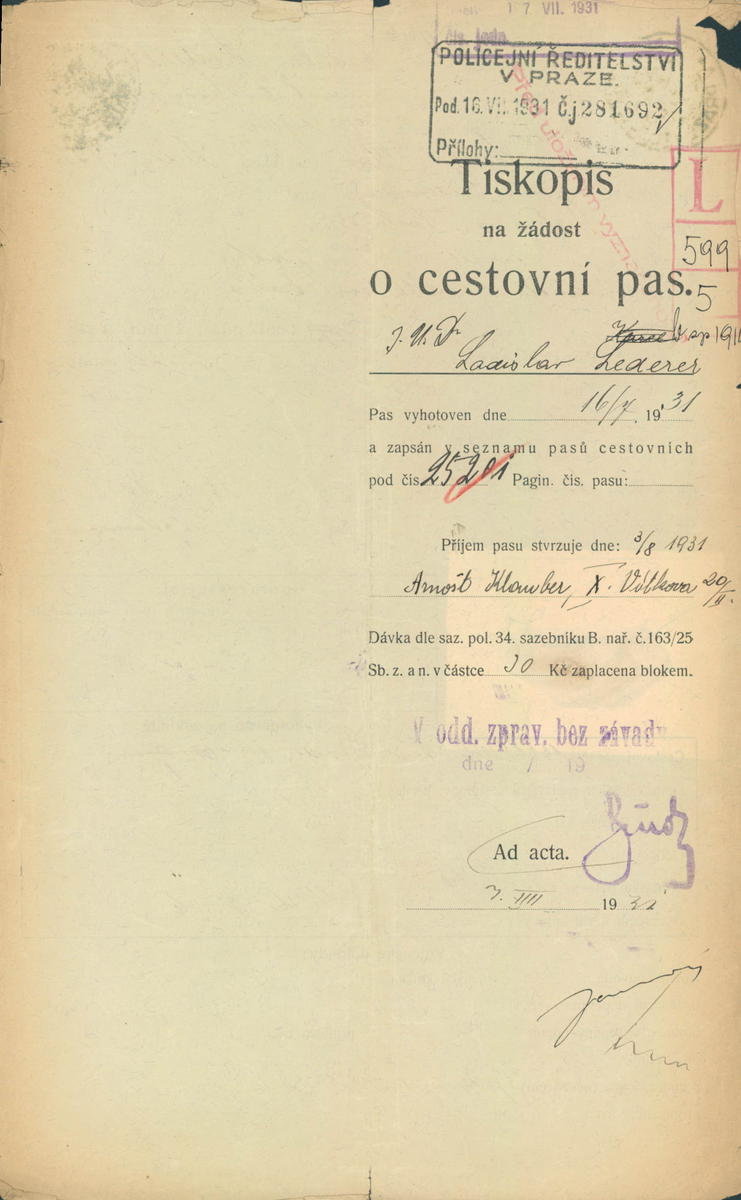 Lederer Ladislav: Žádost o prodloužení cestovního pasu