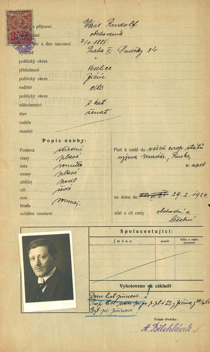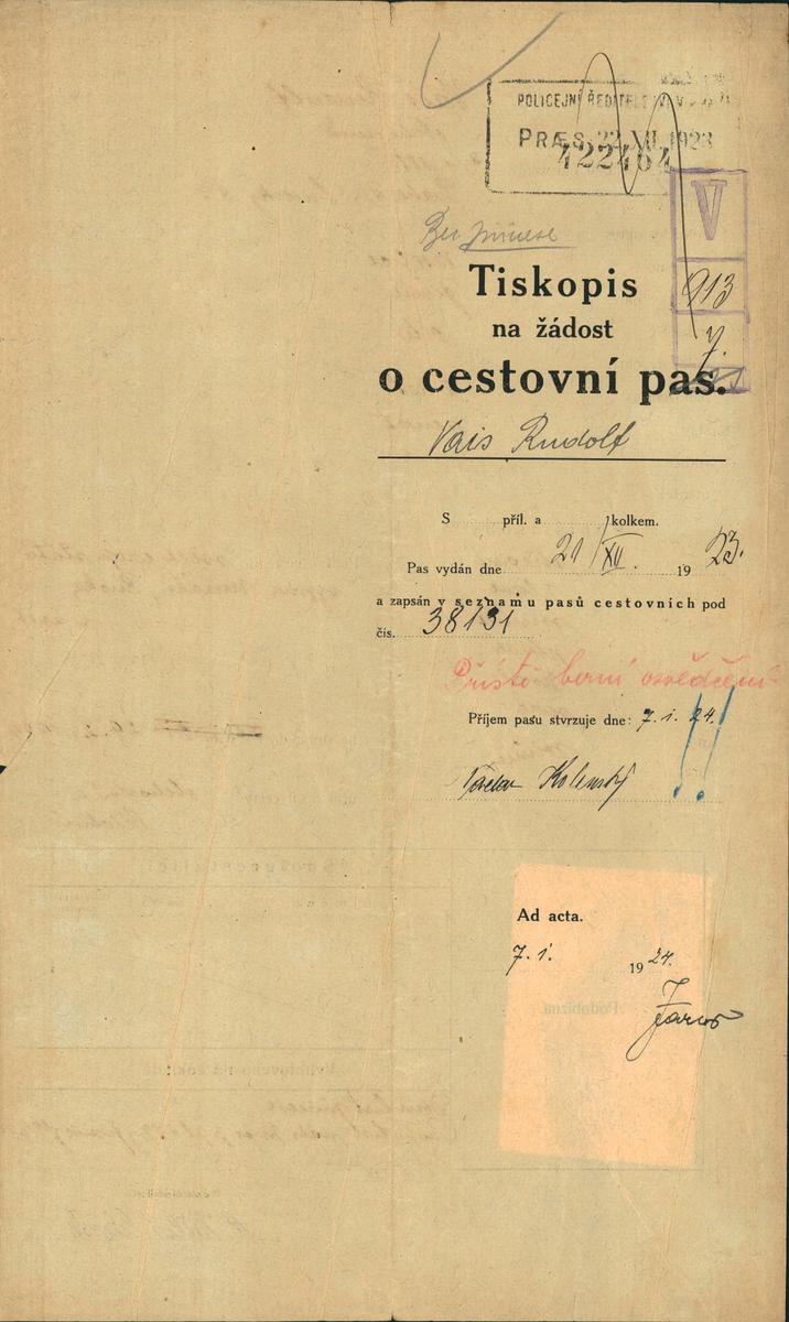 Vais Rudolf: Žádost o vydání cestovního pasu