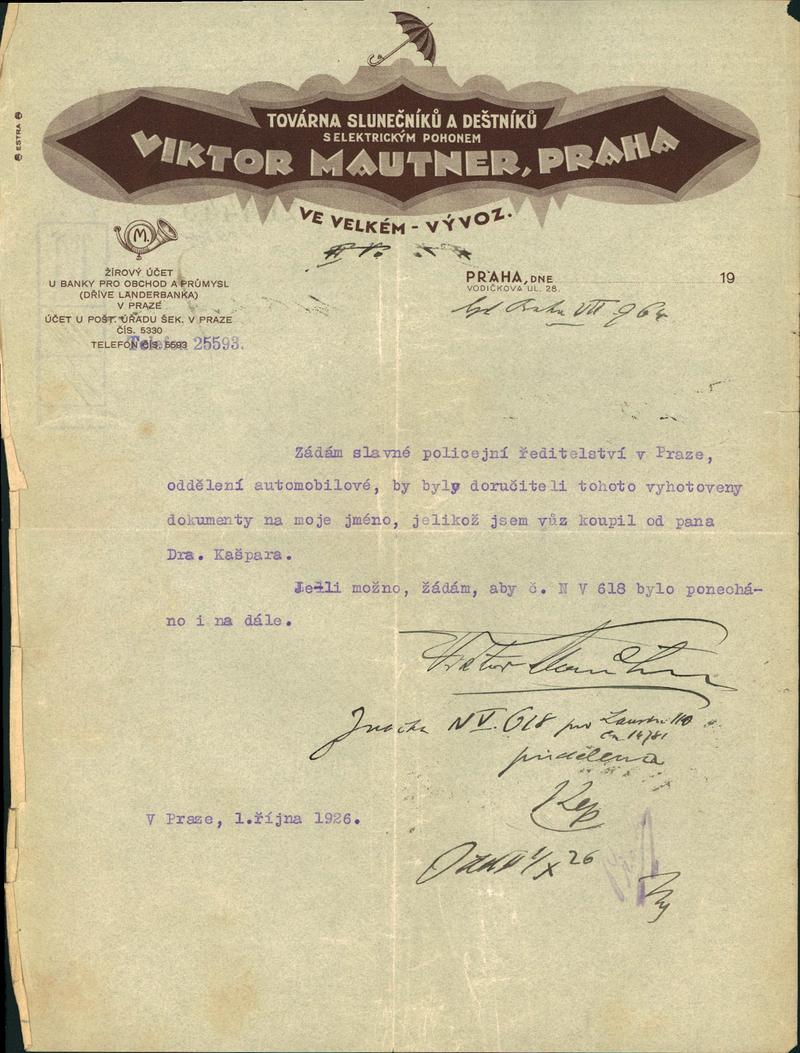 Mautner Viktor: Žádost o vystavení dokladů k automobilu