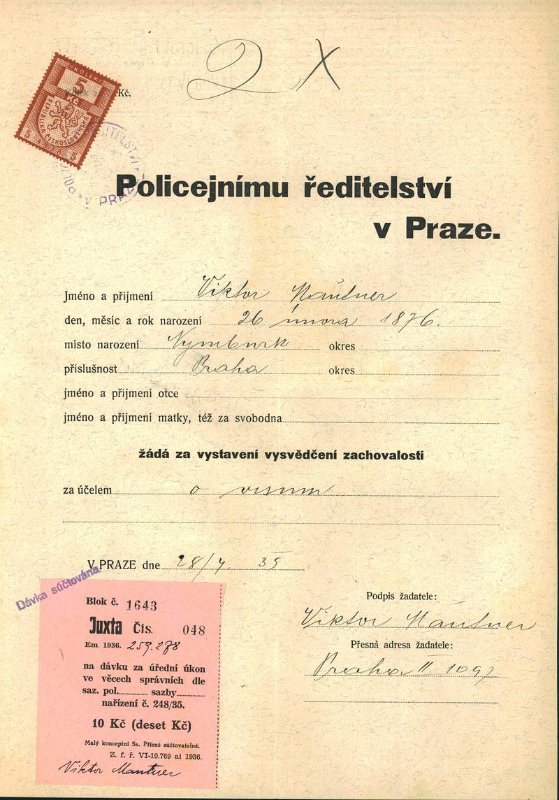 Mautner Viktor: Žádost o vystavení vysvědčení zachovalosti
