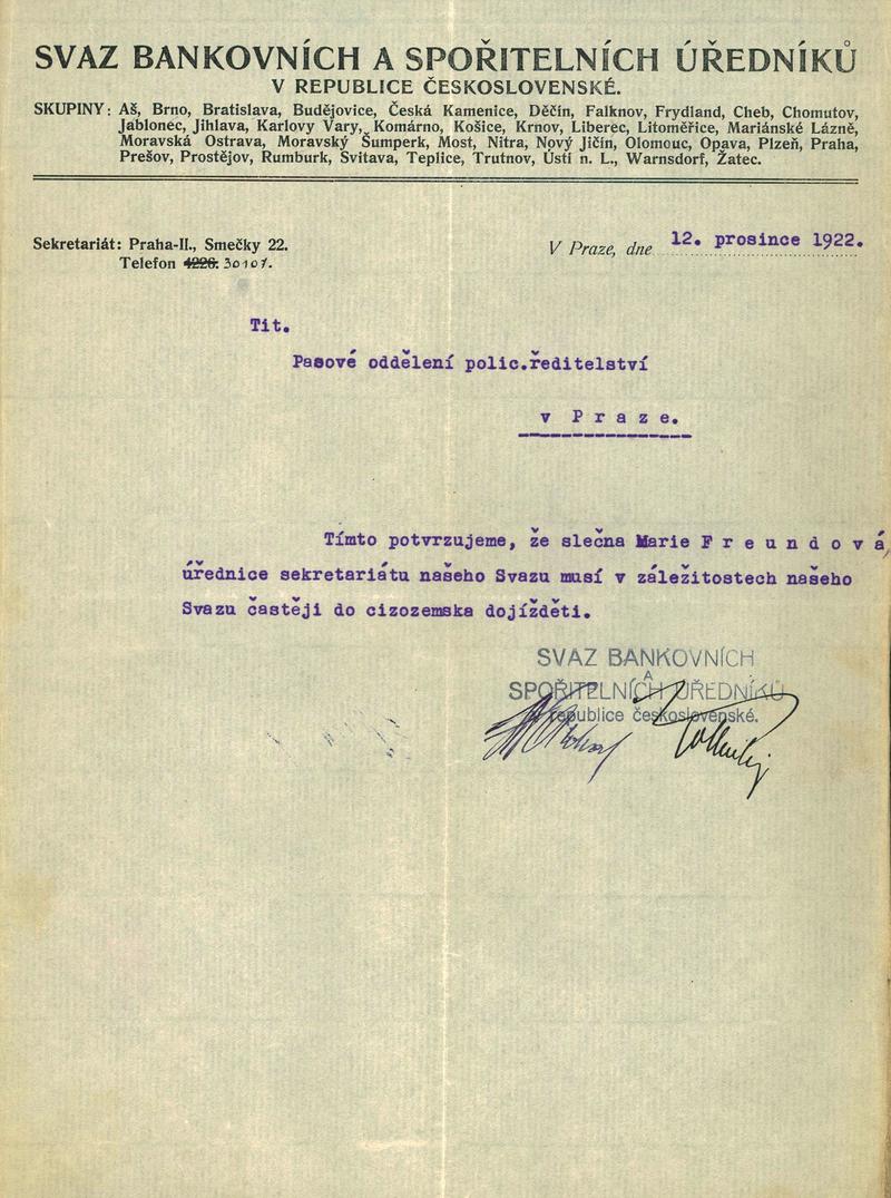 Metzlová Marie Hermína: Potvrzení o zahraniční cestě