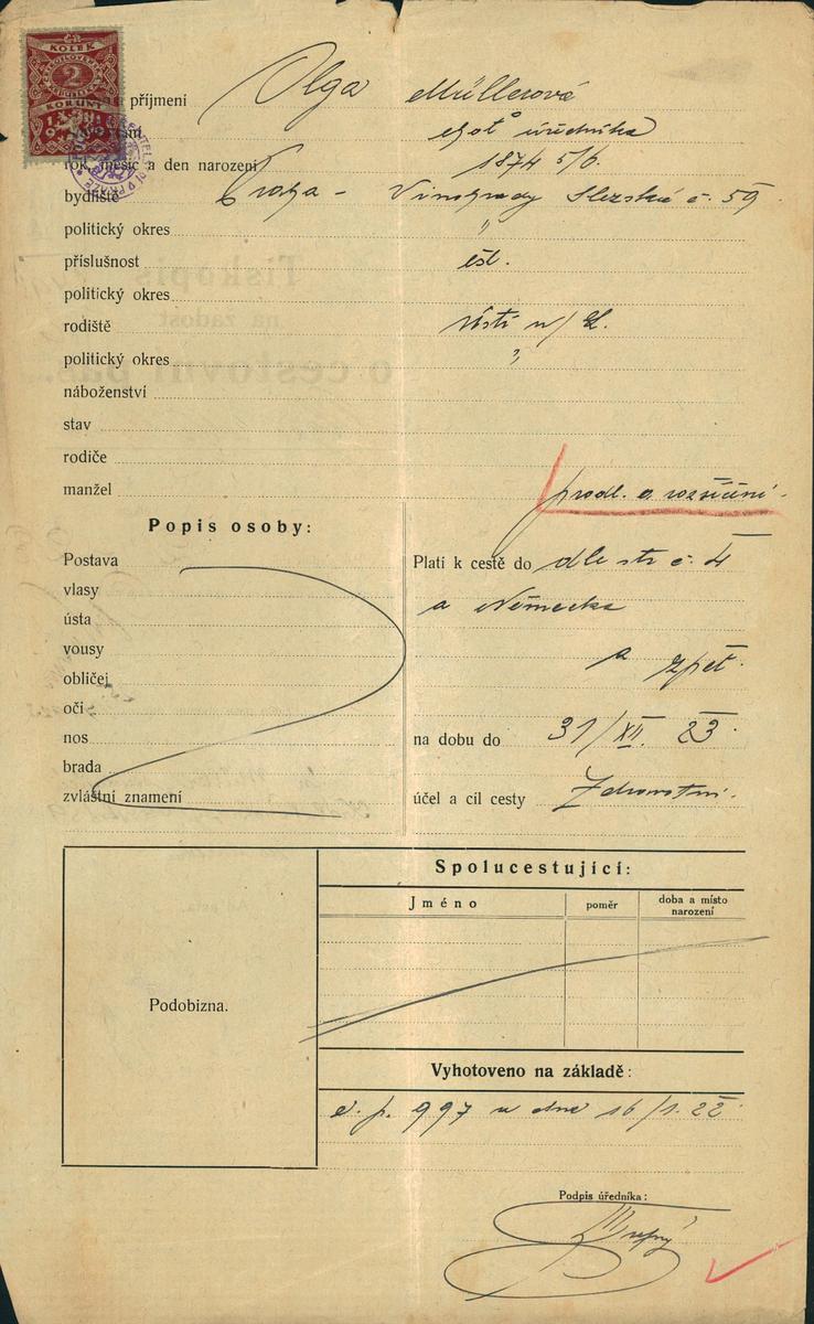 Müllerová Olga: Žádost o prodloužení a rozšíření cestovního pasu