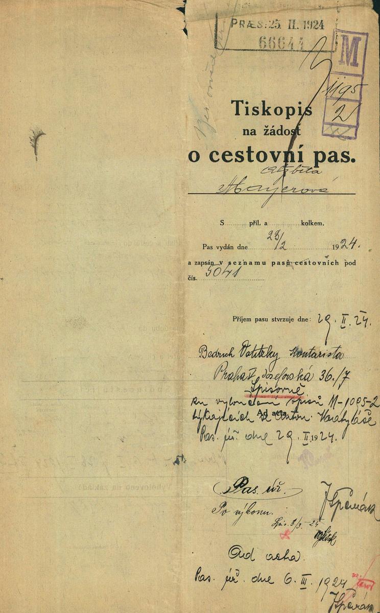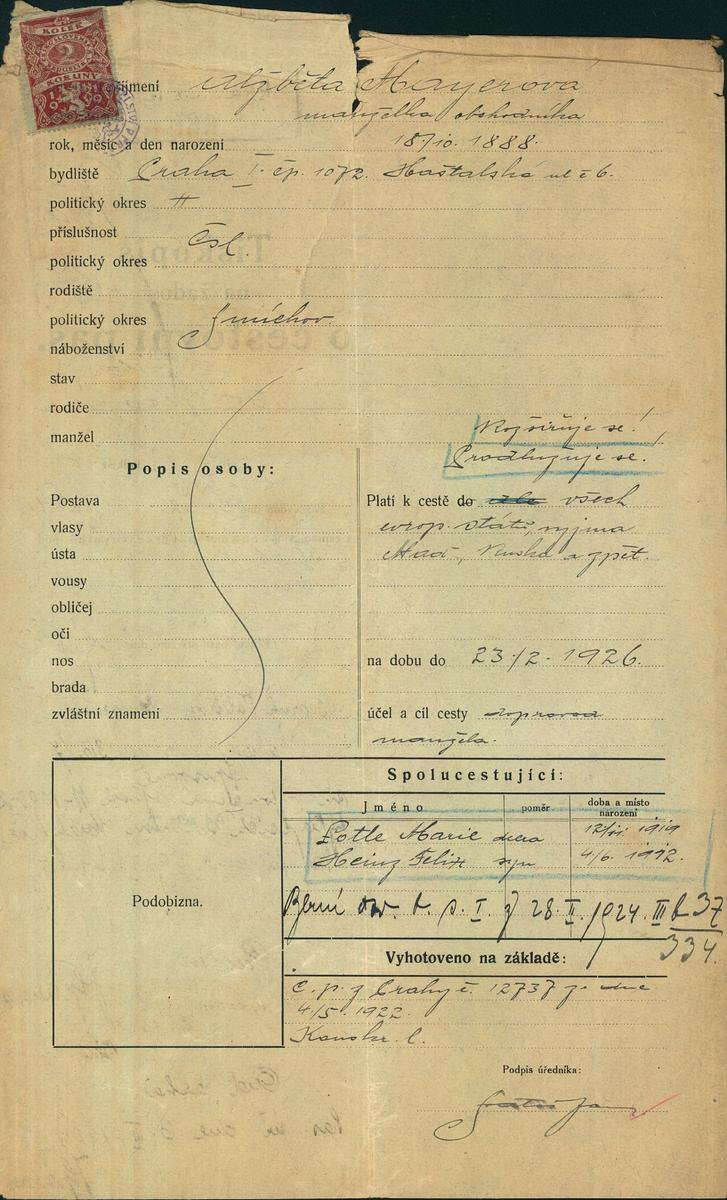 Mayerová Alžběta: Žádost o prodloužení a rozšíření cestovního pasu