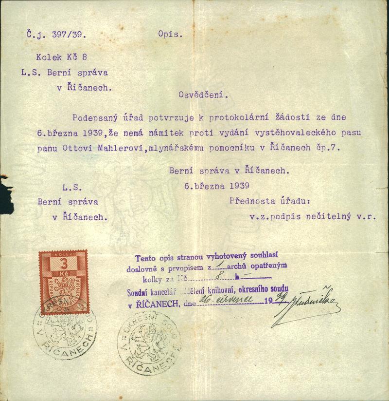 Mahler Otto: Souhlas s vydáním cestovního pasu