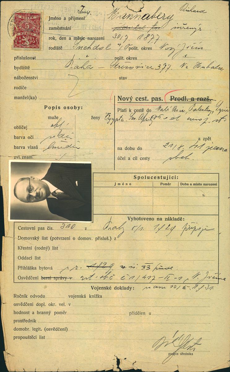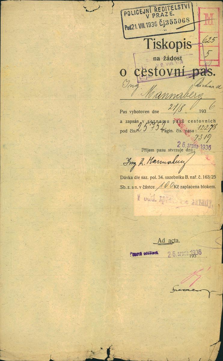 Mannaberg Richard: Žádost o vydání cestovního pasu