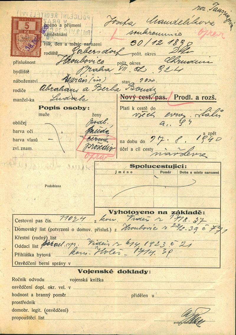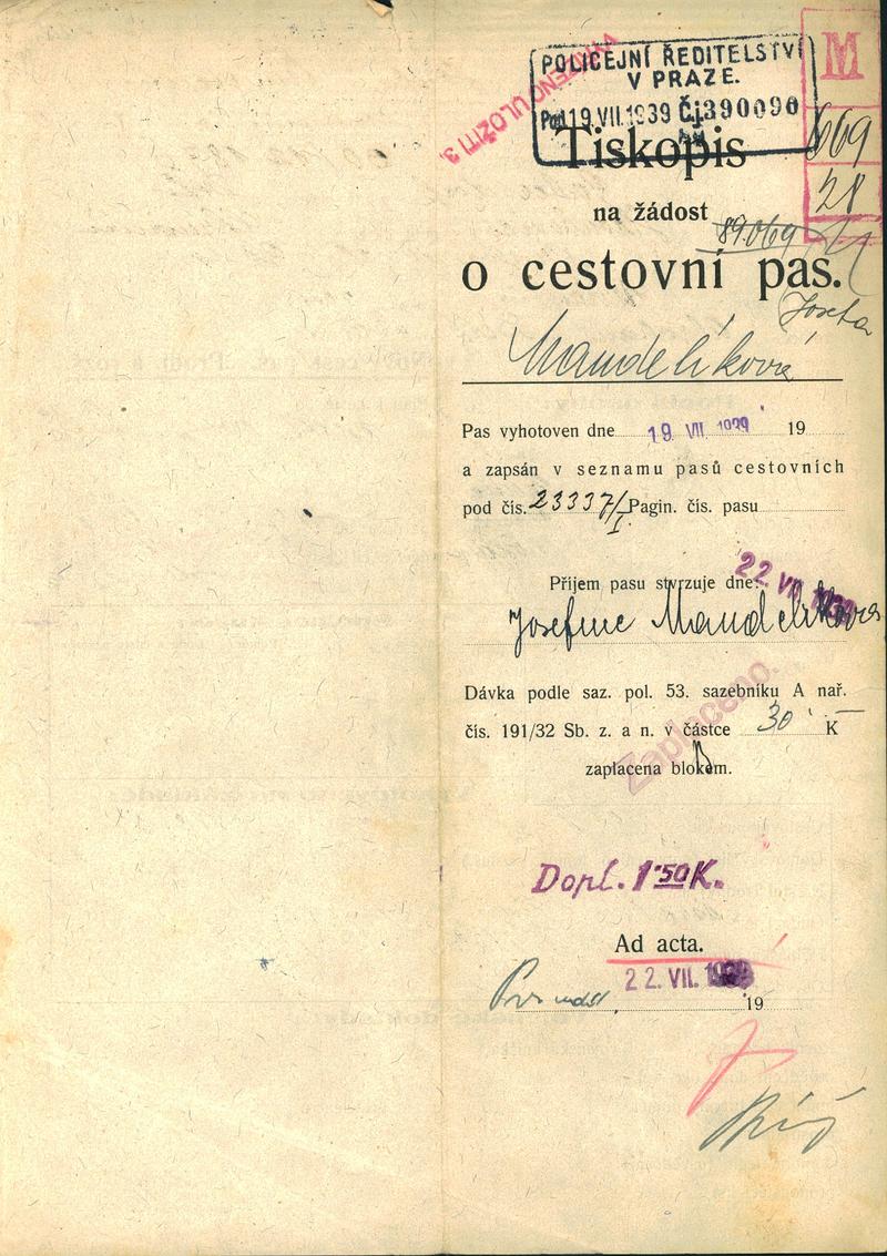 Mandeliková Josefina: Žádost o prodloužení a rozšíření cestovního pasu
