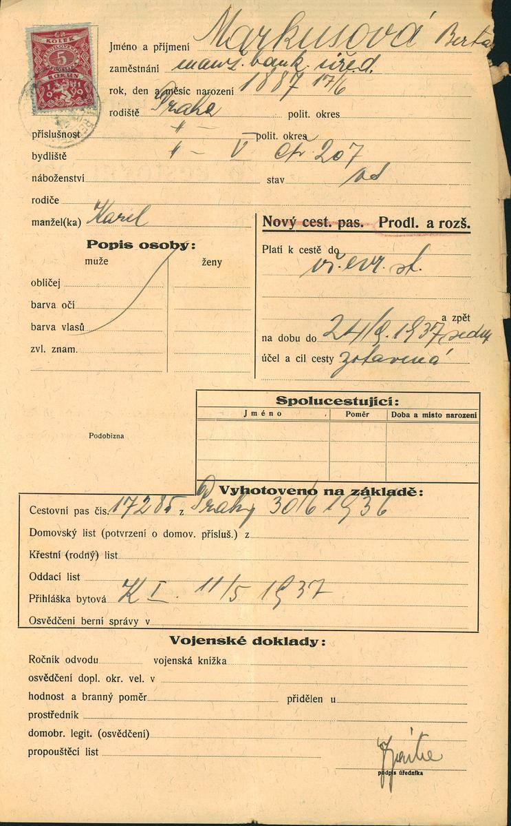 Markusová Berta: Žádost o prodloužení a rozšíření cestovního pasu