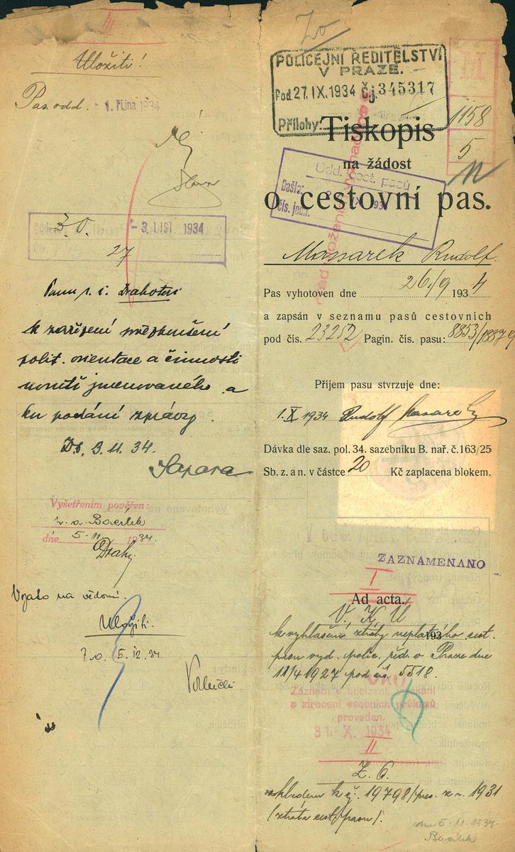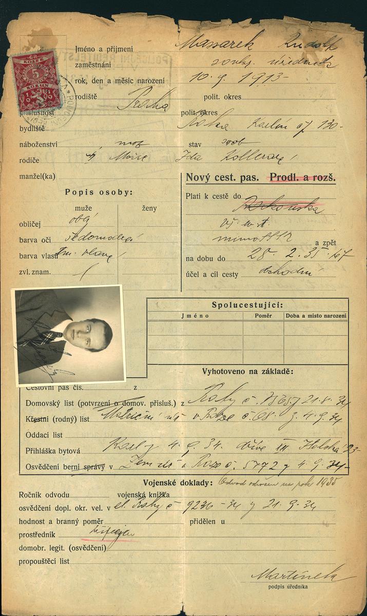 Masárek Rudolf: Žádost o vydání cestovního pasu