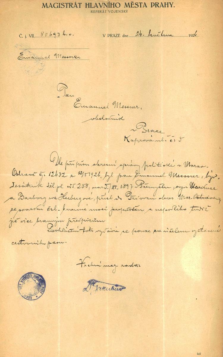 Messner Emanuel: Potvrzení pro účely vydání cestovního pasu