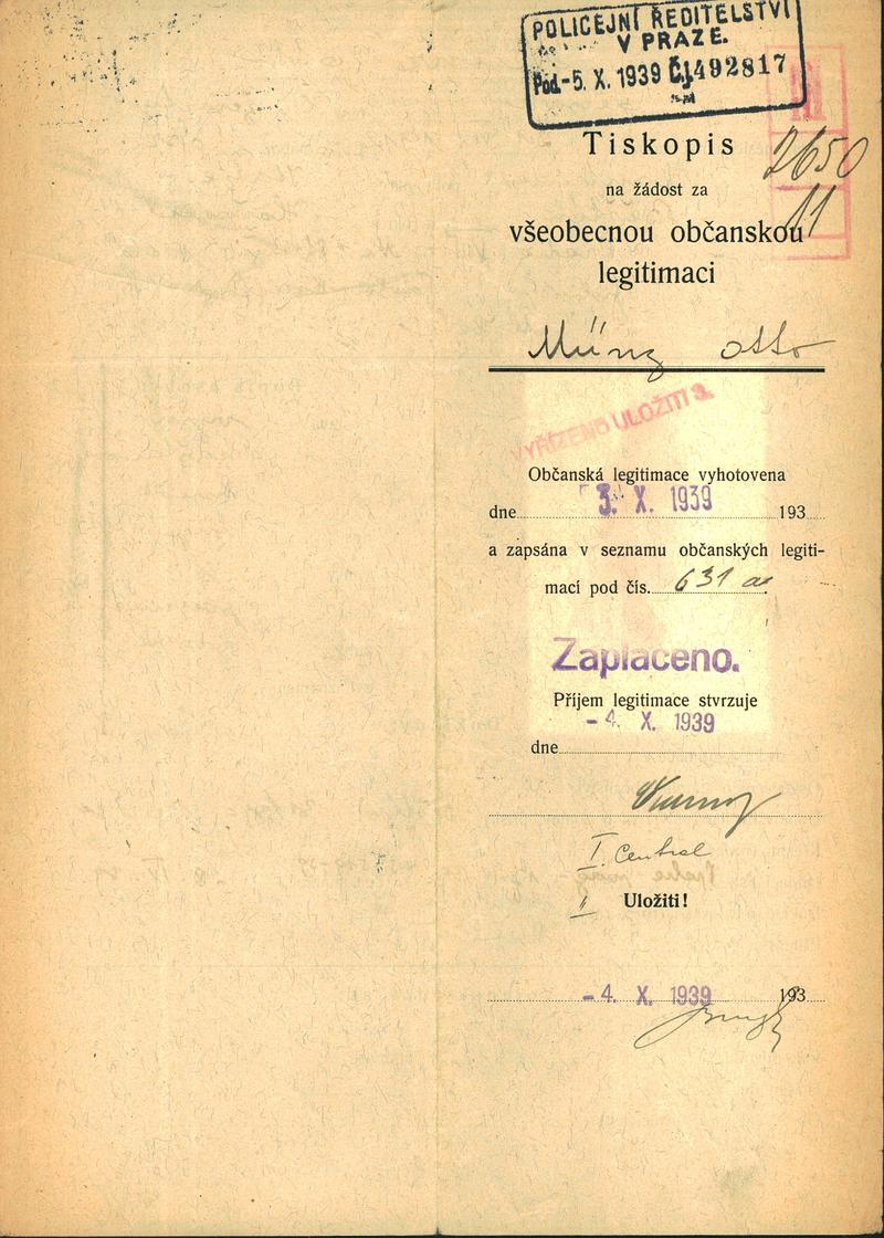 Münz Otto: Žádost o vydání občanské legitimace