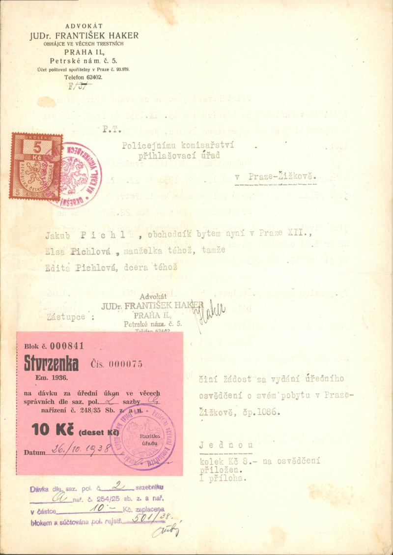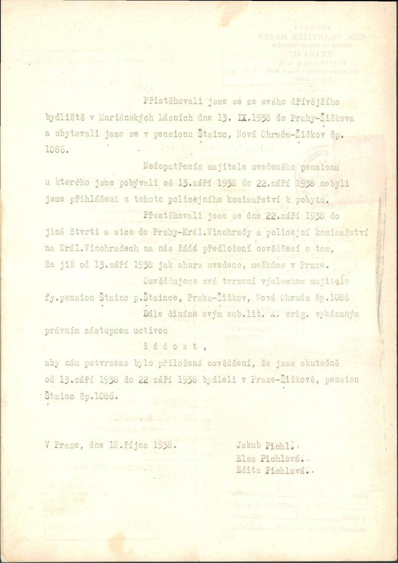 Pichl Jakob: Žádost o potvrzení pobytu