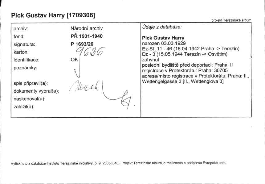 For publication purposes, contact the National Archives in Prague, where the original document is located. The document was digitized by the Terezín Initiative Institute, the Terezín Album project