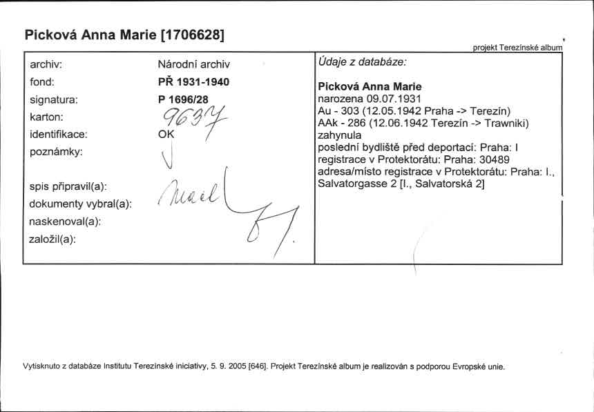 For publication purposes, contact the National Archives in Prague, where the original document is located. The document was digitized by the Terezín Initiative Institute, the Terezín Album project