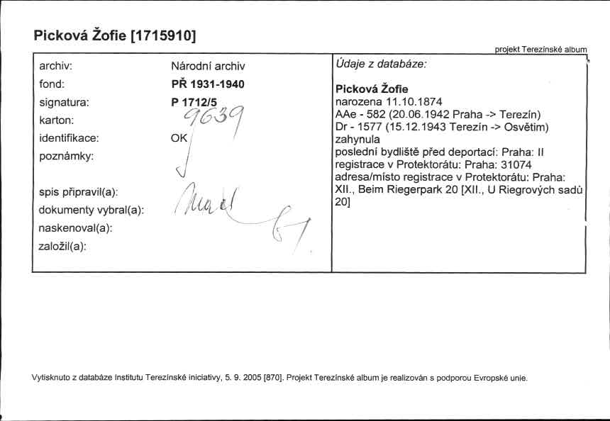For publication purposes, contact the National Archives in Prague, where the original document is located. The document was digitized by the Terezín Initiative Institute, the Terezín Album project