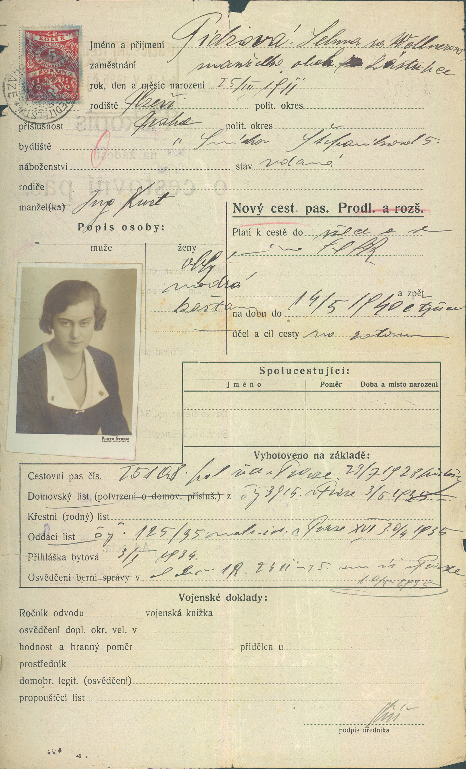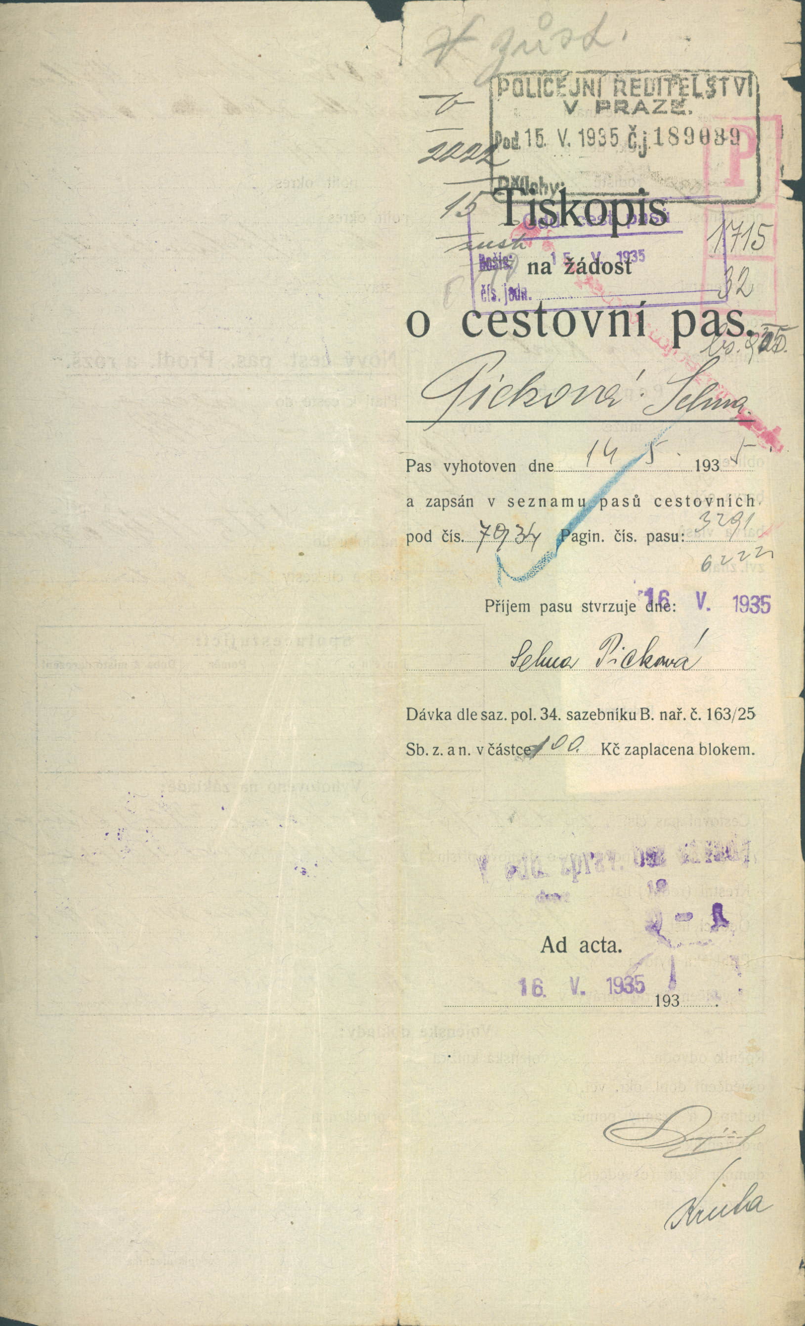 Picková Selma: Žádost o vydání cestovního pasu