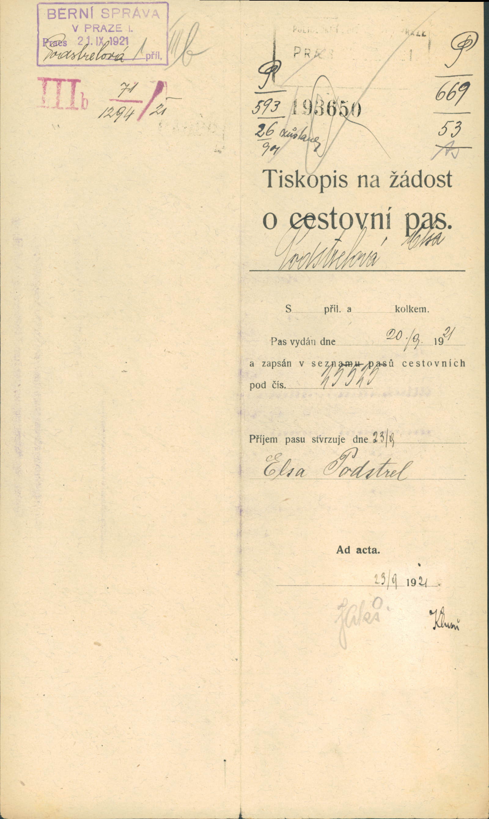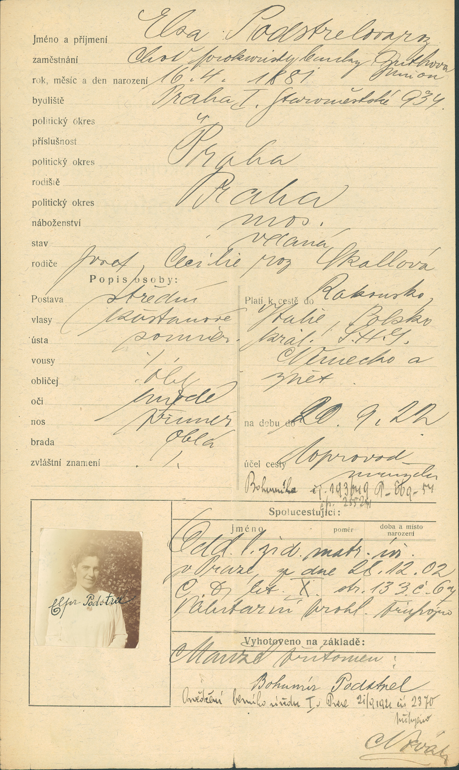 Podstrelová Eliška: Žádost o vydání cestovního pasu
